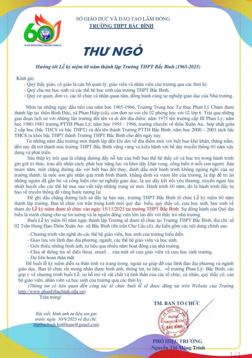 Thư ngỏ hướng tới lễ KỶ NIỆM 60 NĂM THÀNH LẬP TRƯỜNG THPT BẮC BÌNH (1965-2025)