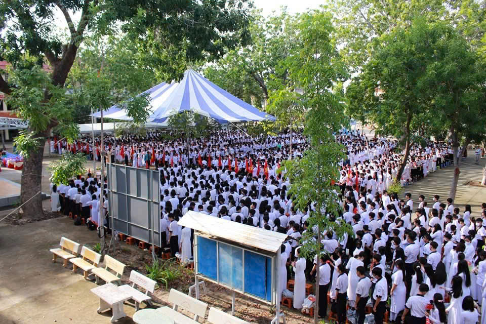 Các em học sinh rất hứng khởi, nghiêm túc theo dõi chương trình của nhà trường và tiếp sóng trực tiếp của VTV1 (đài truyền hình Việt Nam) lễ kỷ niệm 80 năm thành lập Bộ giáo dục và đào tạo qua màn hình led trên sân khấu chính của trường.